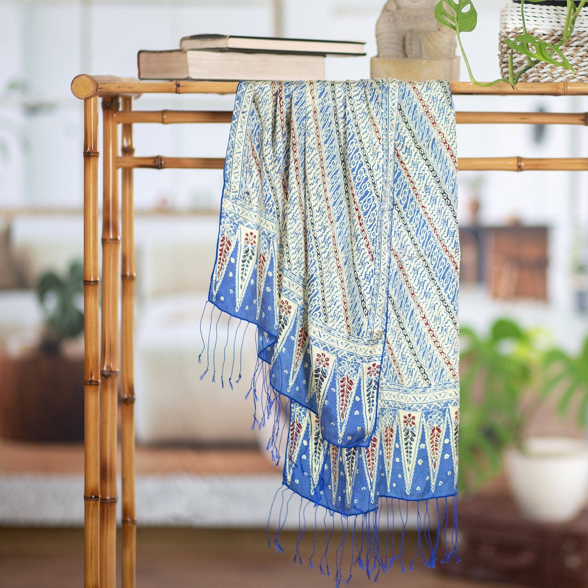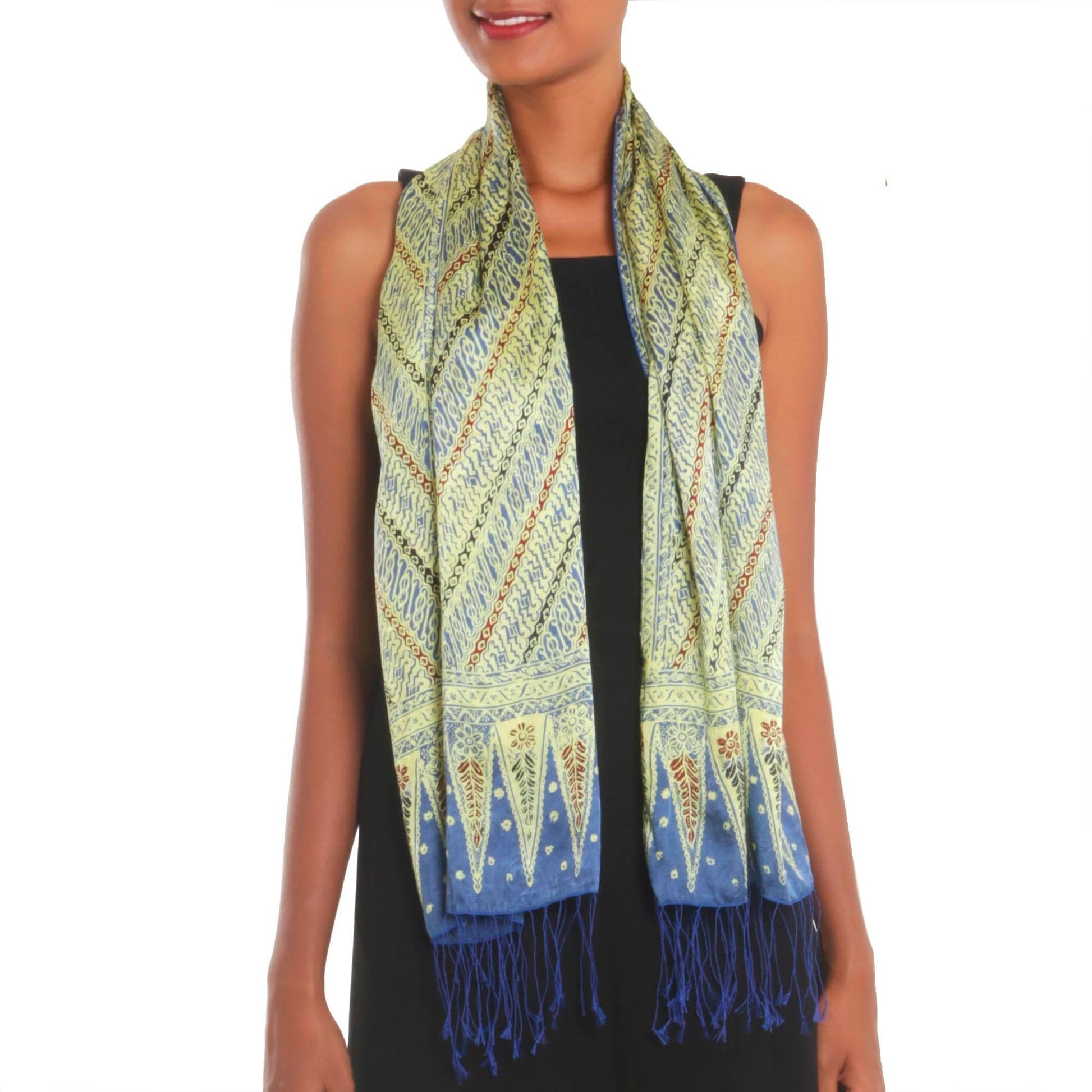 Majestic and regal, this silk scarf from Bali wraps the wearer with elegance, marked by hues of chartreuse and indigo. Yuni Kristina designs the scarf in the batik style, using wood blocks to hand-stamp a wax resist before applying the colorful dyes. Delicate fringe work completes this accessory.
