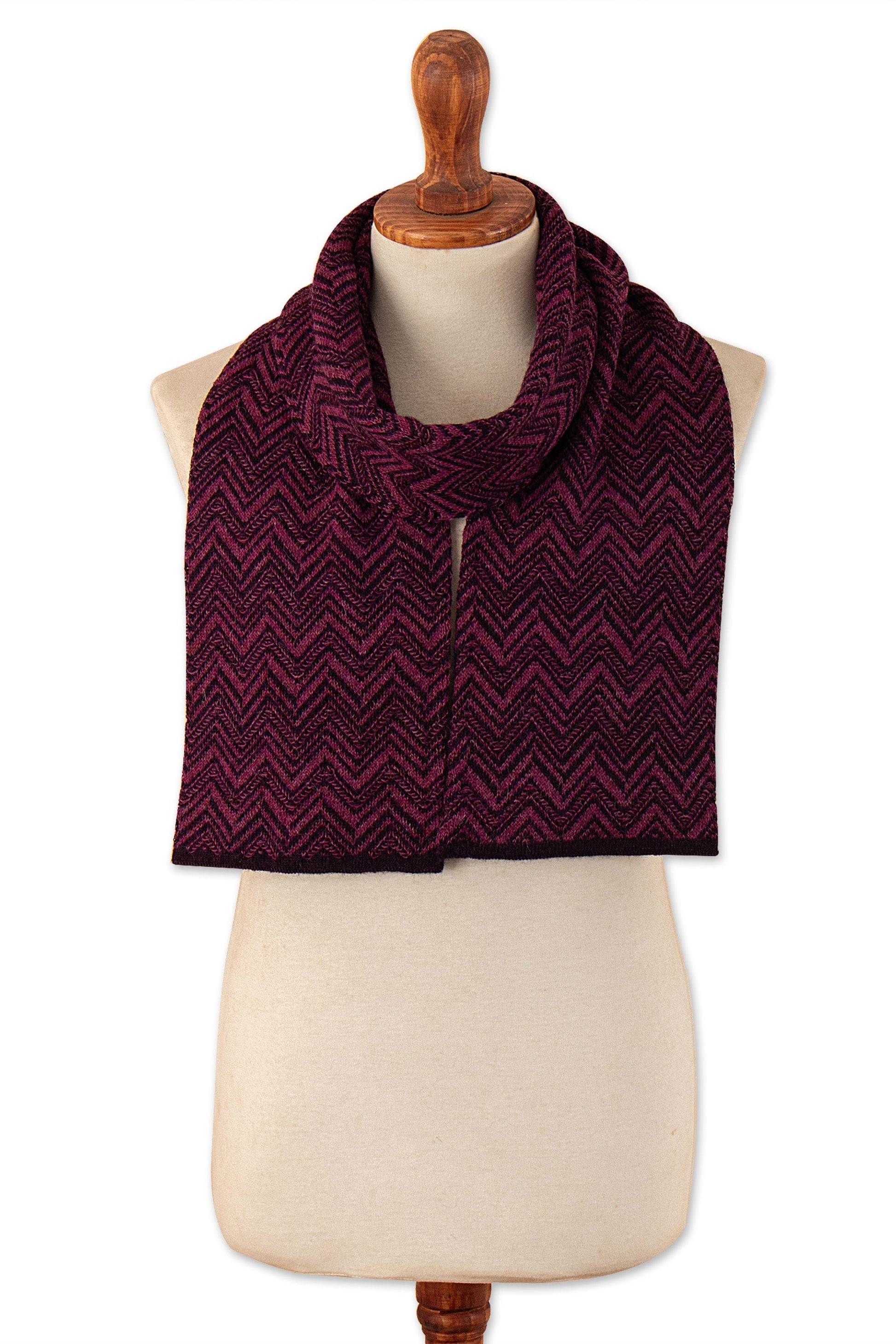 100% Alpaca Knit Scarf with Chevron Pattern in Purple Hues - Mountain Range in Berry