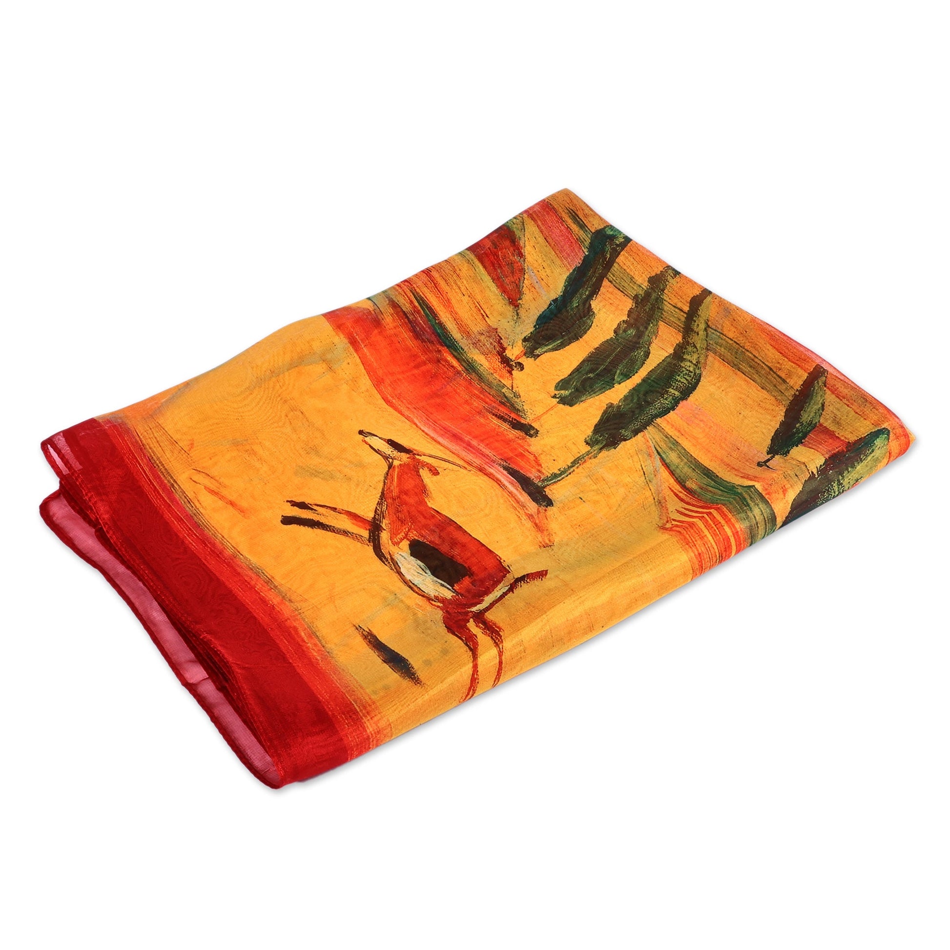 Soft and sheer threads of silk recreate Martiros Sarian's famous 'Gazelles' painting. Hasmik Movsesyan honors Armenian culture through this sublime chiffon scarf, whose lightweight drape showcases a hand-painted gazelle exploring the region's wild landscapes. A palette of orange, red and green hues brings each detail to life, merging boldness with sophistication.