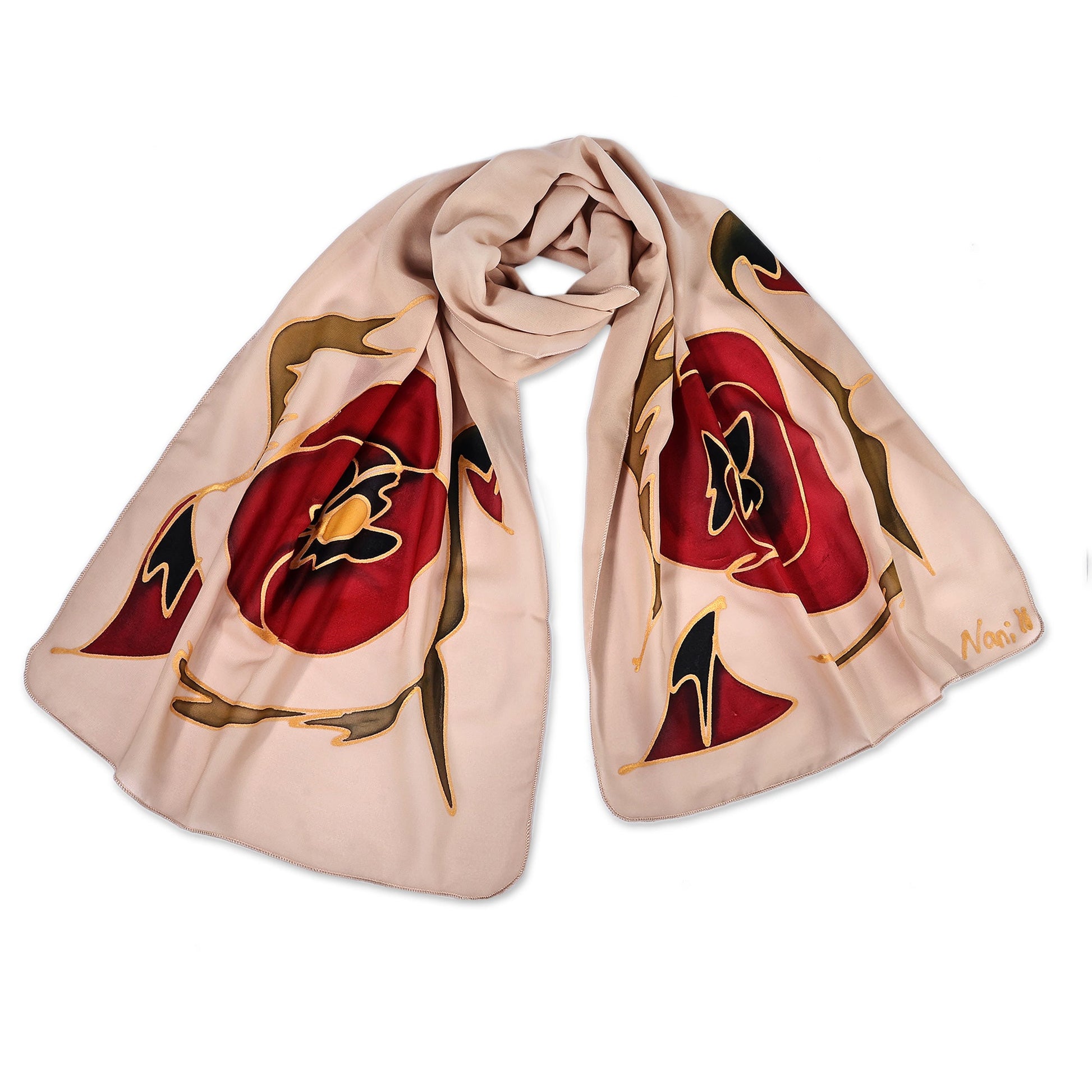 Armenian-Made Hand-Painted Red Tulip Silk Scarf in Beige - Romantic Tulip