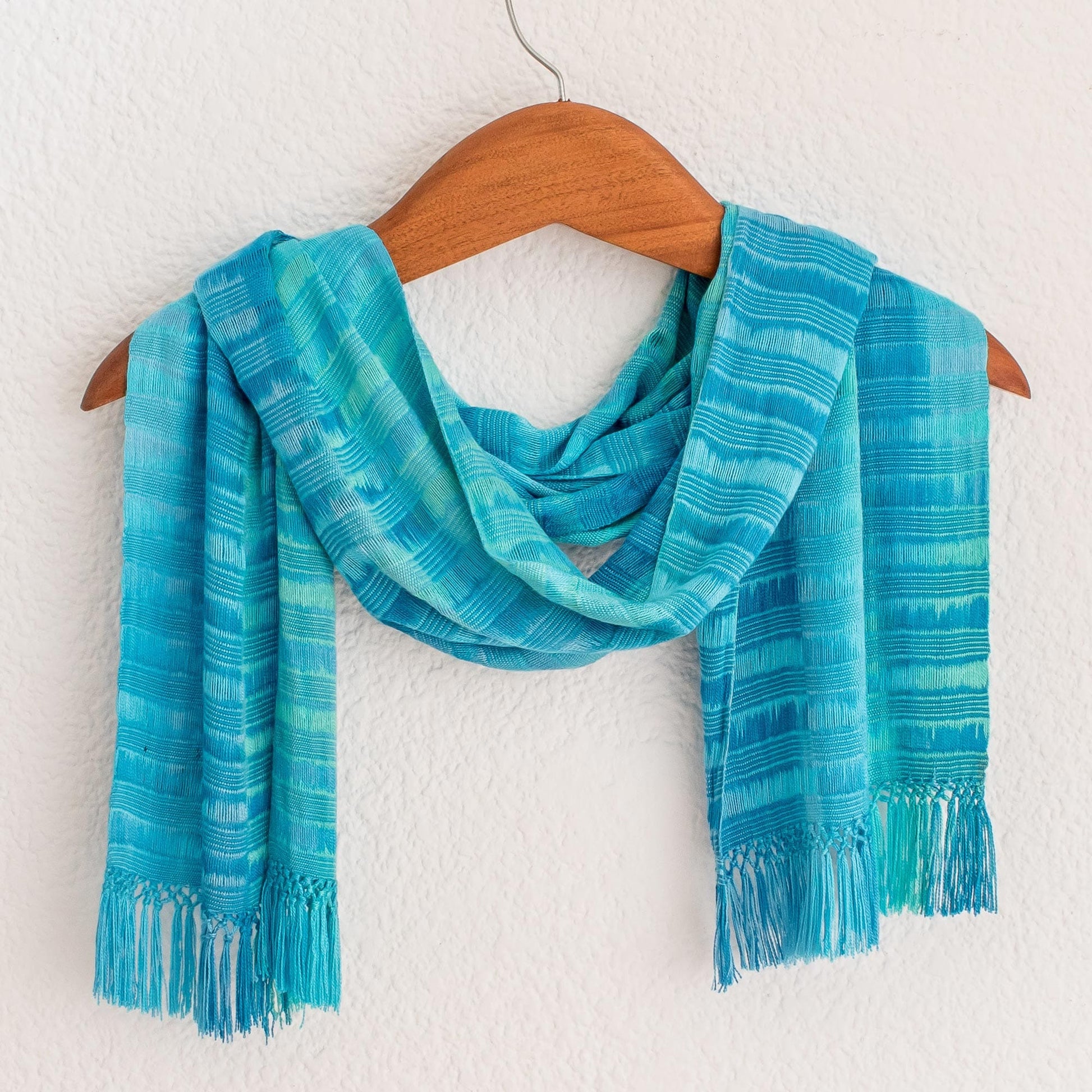 Bands of blue shade from pale azure to deep turquoise. Working on the backstrap loom, Maya artisans from K'amolon K'i K'ojonel transform rayon made from bamboo fiber into a lightweight handwoven scarf. Lavish fringe trims each end.