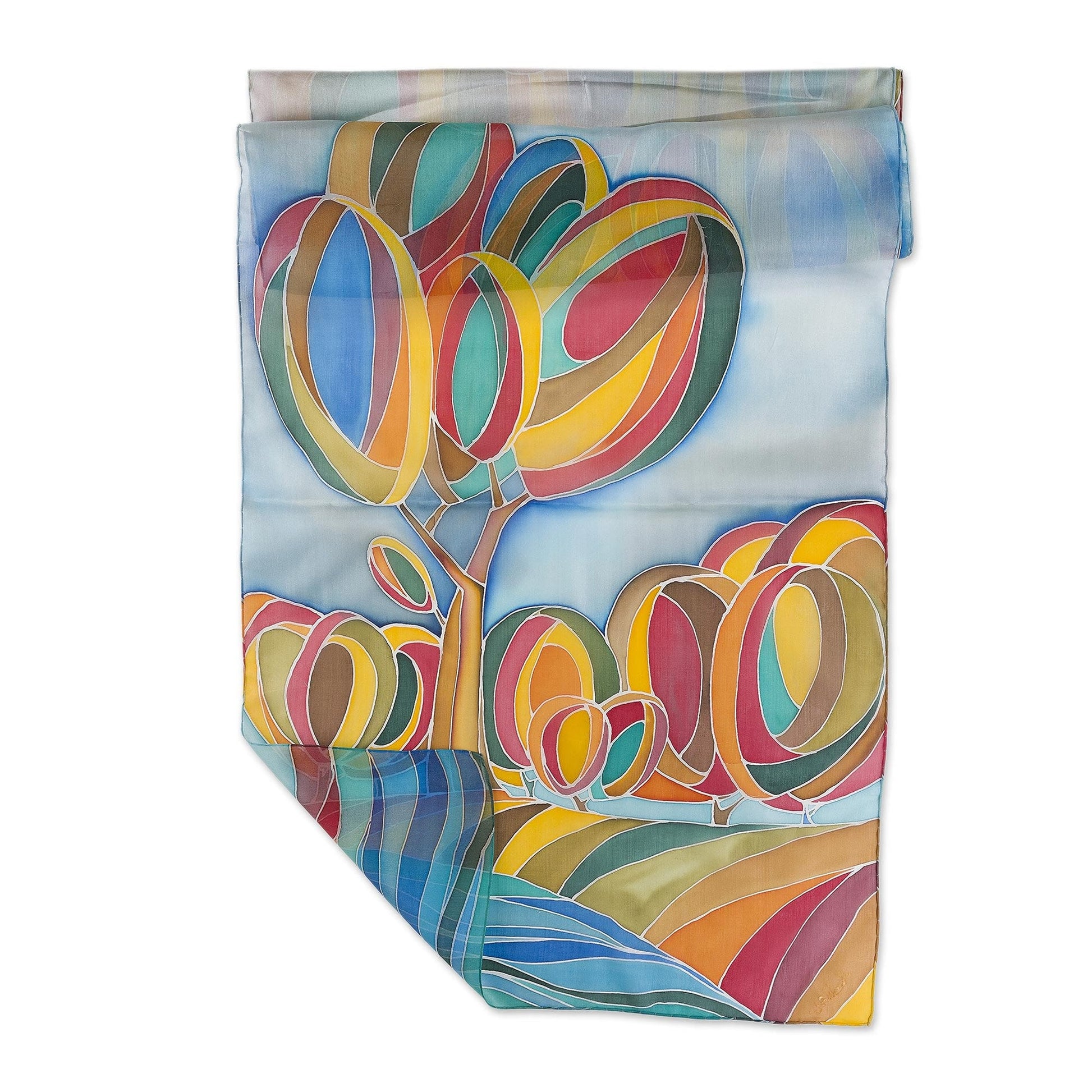 This silk scarf is handmade in Armenia by sisters Anna and Azatuhi Stepanyan. The scarf is hand painted in the technique of cold batik. Capturing the beauty of the forest in autumn, the scarf features colorful stylized treeas against a background of sky blue.