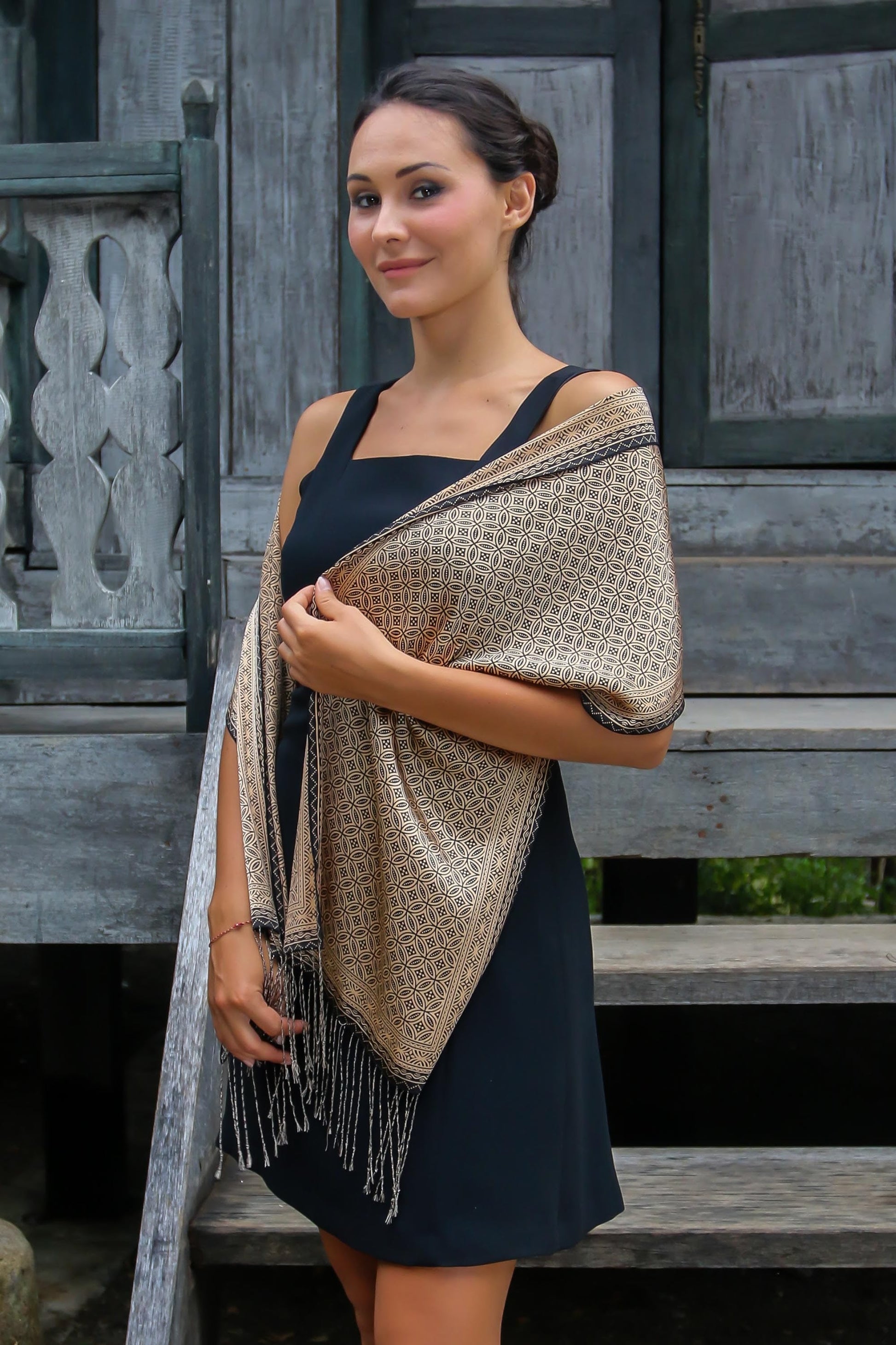 Golden rings intertwine on a glowing expanse of silk. The intricate circles are created by hand in batik. Versatile and lovely, the exquisite fringed scarf comes from Melati's Collection.