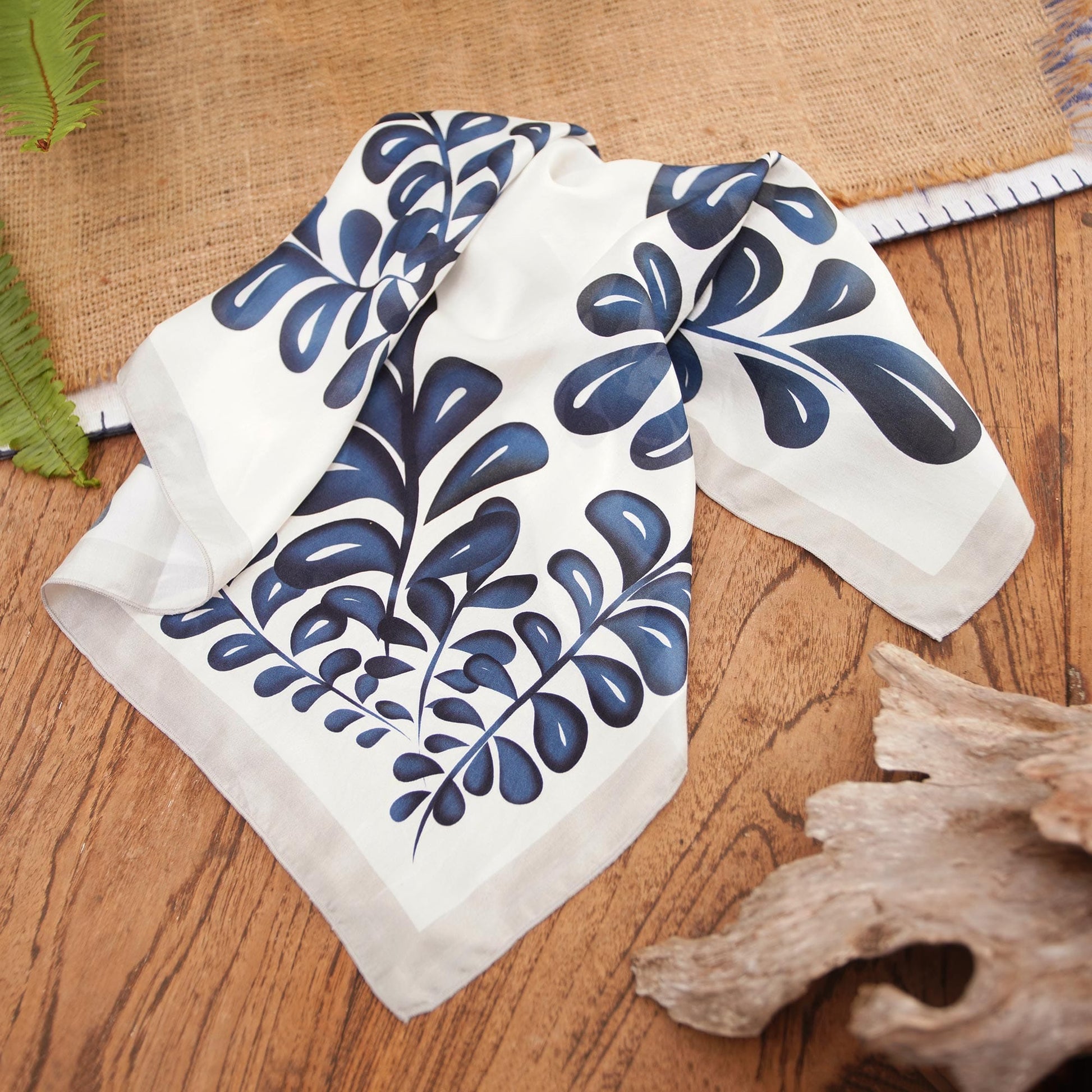 Step into style with this versatile scarf by Bali's Hari and Arthur. The bandana features a black and white leaf motif printed on 100% silk that will instantly brighten any outfit. Use it as a hair tie, slip it into your bag to use as a handkerchief, or tie it around your neck as a chic scarf.
